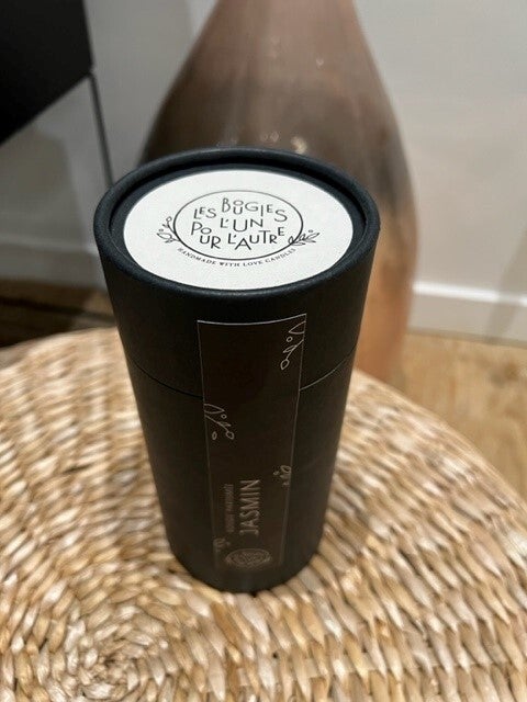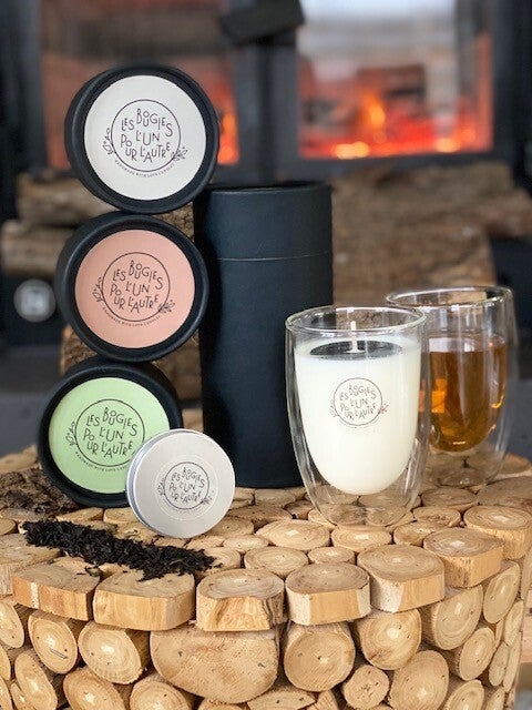 Dans cette gamme, Les bougies l'un pour l'autre prévilègent un comportement éco-responsable. la box noire, la boite à thé et le contenant sont réutilisables.